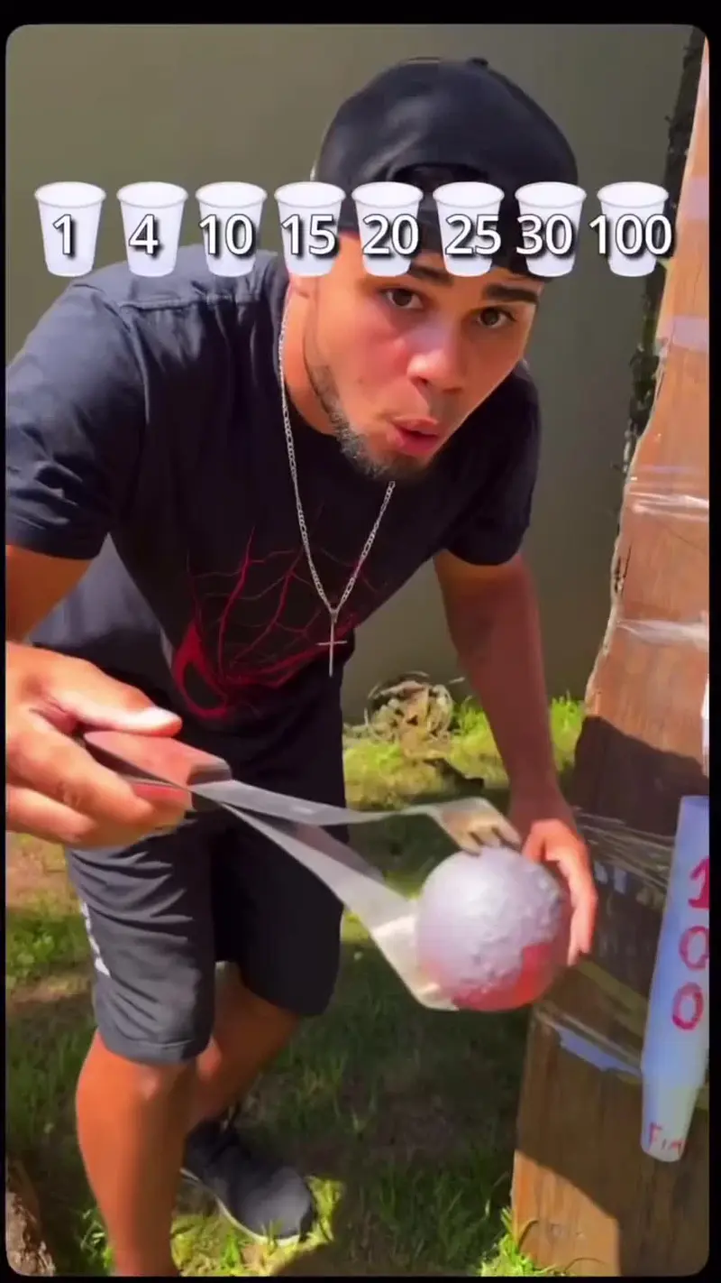 Instantly intrigue your audience with mesmerizing destruction using the "Cup Score" video hook! This unique hook video clip features a hot ball dropped into vertically arranged plastic cups, each marked with points (lowest on top, highest at bottom). Viewers watch, captivated, as the ball melts its way through each cup, creating a satisfying yet destructive path downwards. It’s a highly attention grabbing hook perfect for the start of your video.